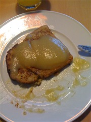 Rezept: Milch und Ei (ganz) zusammen verquirlen, Brotschnitten darin einweichen, dann mit etwas Butter in der Pfanne anbraten. Dazu reicht man Apfelmus, Zucker, Zimt