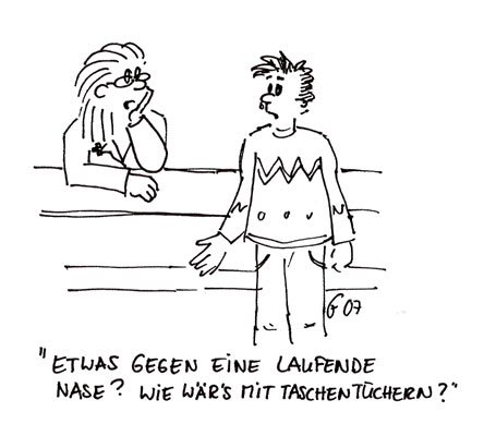 Aber wir können zumindest die Symptome (Beschwerden) lindern: dass die Nase nicht so läuft wie ein Wasserhahn, dass der Husten die Umgebung nicht so stört in der Vorlesung oder im Konzert, dass die Gelenke nicht so schmerzen. Ich finde das ist doch schon was!