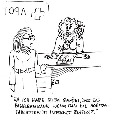 […] und dann noch ein Link zu einer Zeichnung mit bärtiger Frau in der Apotheke, die einen Bart bekommen hat weil sie die Hormontabletten im Internet bestellt hat……naja….LINK […]