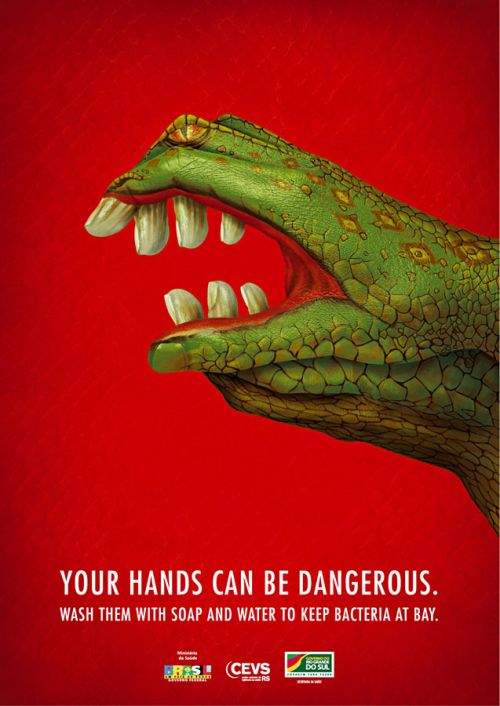 „Ihre Hände können gefährlich sein. Waschen Sie sie mit Wasser und Seife um Bakterien aufzuhalten.“