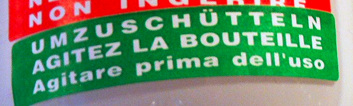 und das italienische ist tatsächlich das korrekteste: Man muss es nämlich vor der Anwendung schütteln – und nicht irgendwann, wie im französischen und deutschen impliziert.