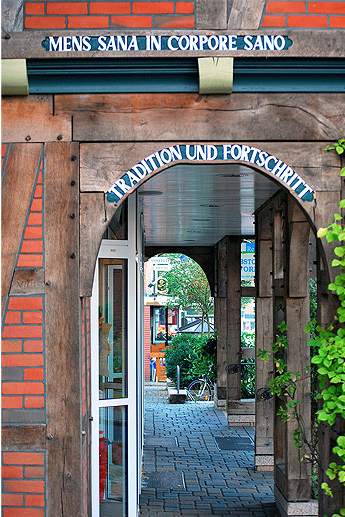 … auf dem Bogen der anderen Seite steht übrigens: Lang leben will jeder, aber alt werden keiner. Und am Giebel findet sich dies: Medicus curat, deus sanat. Hier die 5 Aesculap Stäbe auf der Seite: