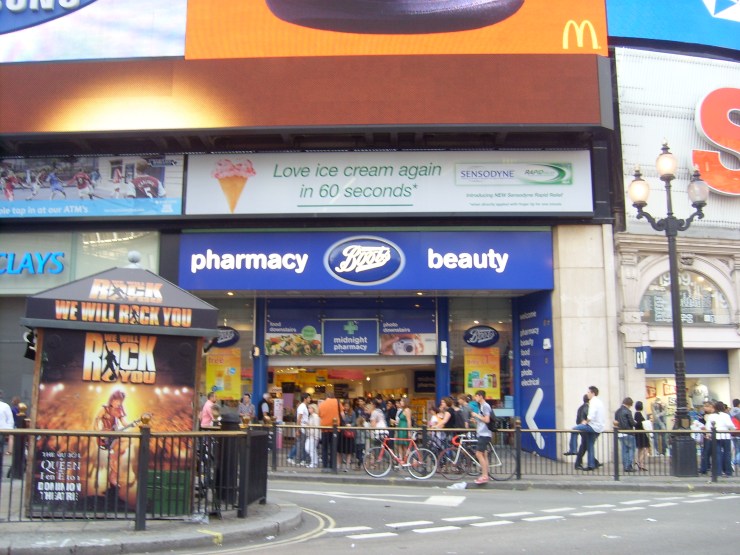 hier ein Bild einer Apotheke -natürlich eine Filiale von Boots am wohl wuseligsten Ort Londons, dem Piccadilly Circus. Sehr groß, sehr wuselig und ich denke den Apotheken in der Schweiz ähnlicher als in Deutschland, da es auch eine Drogerie mit allerlei „Schnick-Schnack“ war.
