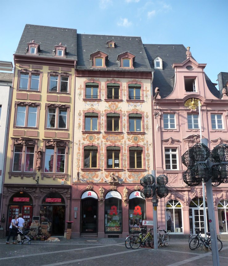 Die Apotheke liegt direkt gegenüber dem Dom. Das Haus stammt übrigens aus den 60ern als der Markt wieder historisierend aufgebaut wurde. Da postiert sich auch gern das ZDF vor, wenn sie mal wieder Passanten befragen wollen, besonders gern an Markttagen, wenn der gesamte Markt proppevoll ist.