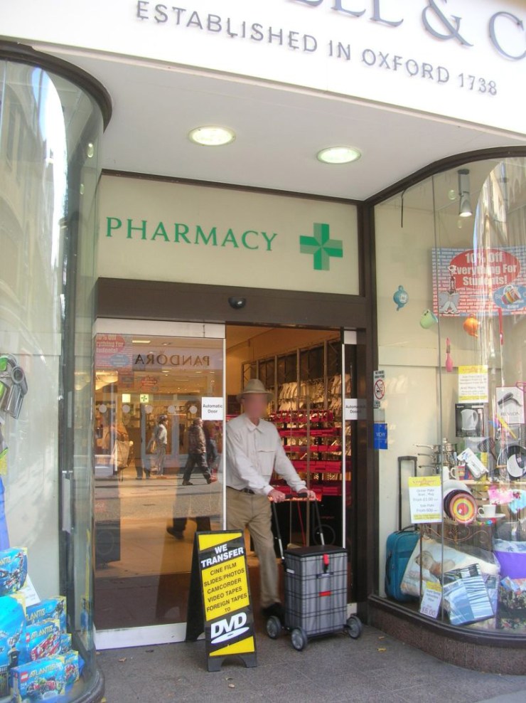 Die eine, die ich gesehen habe, sah eher wie ein Spielzeugladen oder Schmuckladen aus! Ich habe versucht, durch die Tür zu fotographieren. Weil mein Apparat leider recht lange braucht, bis er mal auslöst, lief der Mann leider ins Bild, das andere Bild war verwackelt und ich habe es gelöscht. Falls Du das Bild im Blog zeigen möchtest, kann man das Gesicht vielleicht verpixeln oder so. Diese Apotheke war in Oxford.