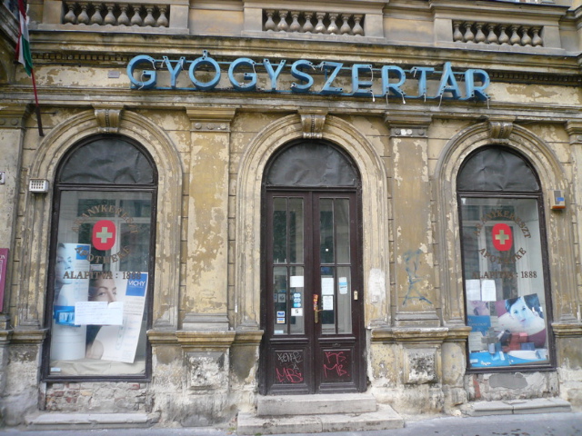 Ich war im Herbst mit einer Freundin in Budapest und wollte dort für Dich eine schöne Apotheke fotografieren. Wie Du siehst, war ich nicht sehr erfolgreich, was das „schön“ angeht, aber interessant fand ich das Exemplar mit dem „Schweizerkreuz“ trotzdem. Bei näherer Betrachtung (also wirklich von gaanz nah) erkennt man, dass es sich nicht um ein Schweizerkreuz, sondern ein goldenes Kreuz handelt. Wenn man ungarisch spricht, hilft das natürlich auch, es ist nämlich die Goldene Kreuz Apotheke. :-)