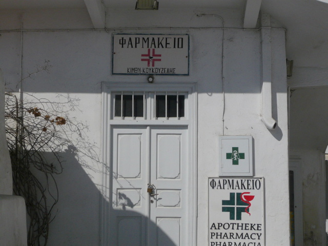 Die andere Apotheke habe ich 2009 auf Mykonos fotografiert. Auch hier mit mässigem Erfolg – geschlossen… Die könnte ich mir von innen sehr hübsch vorstellen! Damals wusste ich noch nichts von Deinem Interesse an fremden Apotheken, sonst hätte ich mir mit der Aufnahme mehr Mühe gegeben und nicht die Hälfte abgeschnitten…. :-p