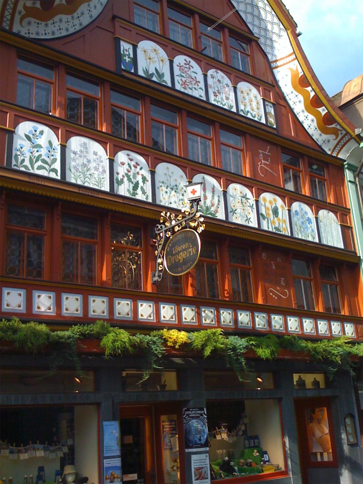 Mit dem Kreuz und den Heilkräutern hätte ich auch gedacht, dass in dem Haus zumindest eine Apotheke früher einmal drin war. Aber das ist nicht so. Die haben nämlich eine Homepage: http://www.loewen-drogerie.ch/48/Chronik.html