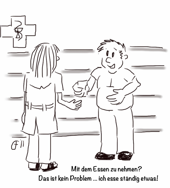 Ist das ein Problem? Kenn mich da ja nicht aus… Warum muss man manche Medikamente mit dem Essen nehmen? Nüchtern versteh ich ja noch, dann werden sie wohl besser aufgenommen, aber was bringt vor/nach/mit dem Essen? LikeLike