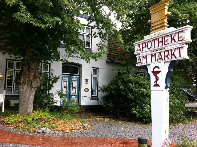 anbei Bilder von einer hübschen alten Apotheke: Die königlich privilegierte Apotheke am Markt in Burg/Dithmarschen (Schleswig-Holstein). Es gibt in dem Ort auch ein kleines Heimatmuseum, in dem man die frühere Einrichtung dieser Apotheke besichtigen kann. Auf den Seiten dieses Museums findet man auch einiges zur Geschichte der Apotheke am Markt: http://www.burger-museum.de/die_museums-apotheke.htm