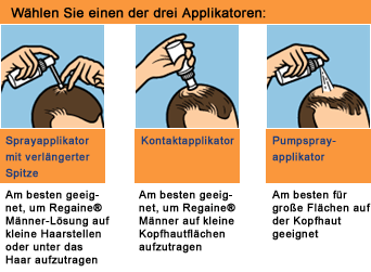 Also vermarktete man die Minoxidil-Lösung als Regaine (oder Rogaine in manchen Ländern) als Mittel gegen Haarausfall – auch genetisch bedingten. Und damit man etwas davon hat, gibt es sie mit verschiedenen Applikatoren – immerhin muss man das auch 2x täglich und regelmässig langfristig anwenden, weil sonst die Haare wieder ausfallen.