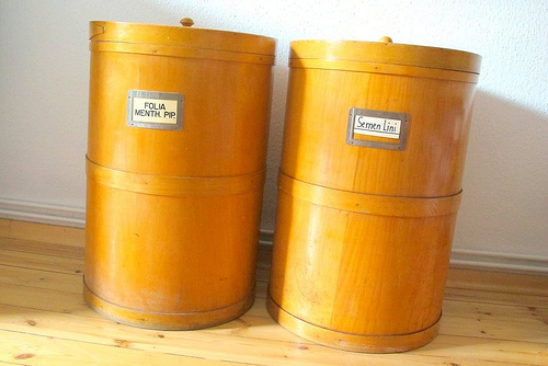Neulich im Schaufenster unserer Apotheke… diese beiden  tollen Dosen aus Holz! Zu Verschenken!!!  Früher beherbergten sie Pfefferminztee („Folia Menth. Pip.“) und Leinsamen (Semen Lini) und sie sind riesig. 70 cm hoch! Ich denke wir werden Stoffe und Spielzeug darin aufbewahren.