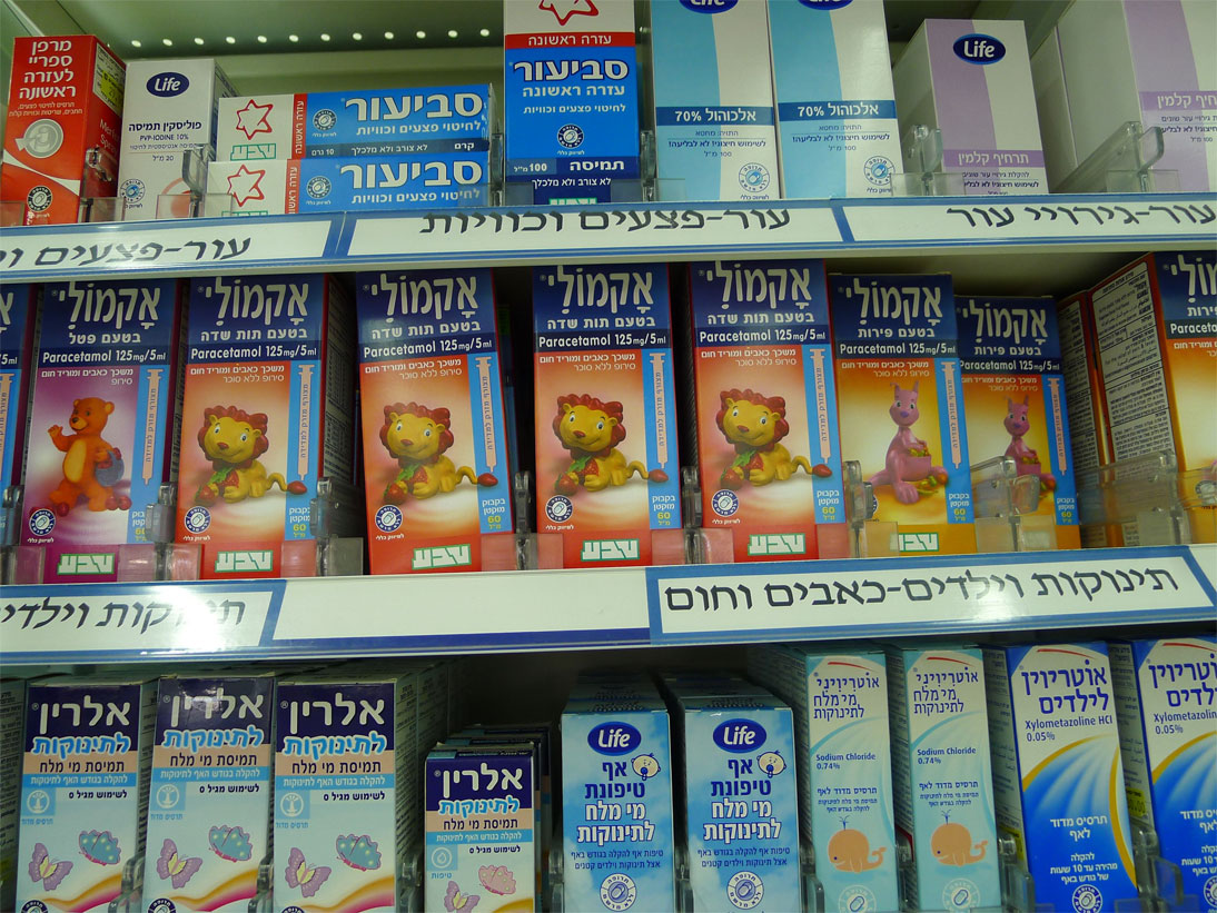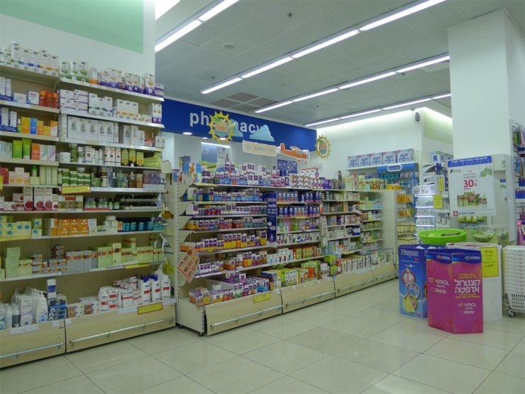 In Israels Städten sieht man vielerorts Filialen der grossen „Super-Pharm“-Kette, wo die Apotheke nur einen kleinen Schalter und ein paar Regale mit freiverkäuflichen Medis im hinteren Teil des Geschäfts ausmacht. Im Rest des Geschäfts ist ein riesiges Angebot von Körperpflegeartikeln, Parfüms, Kosmetika, Windeln, Nahrungsergänzung usw. usw. zu finden.