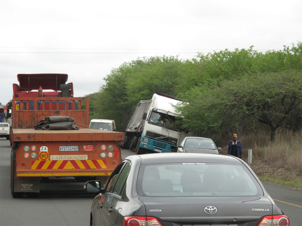 Nur, was sehe ich da vorne? Stauen sich da die Autos? Hat da jemand etwas gesehen? – ach nein, wir sind ja nicht mehr im Krüger, wo es Staus hauptsächlich gibt, wenn jemand einen Löwen oder ein Nashorn entdeckt hat und alle das sehen wollen. Also ein Unfall?