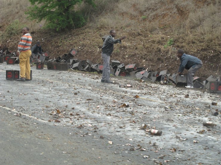 Das war ein Biertransporter (SAB steht auf den Kisten). Und was die ganzen Leute da gerettet haben -waren Bierkisten mit den paar Flaschen, die das überlebt haben.
