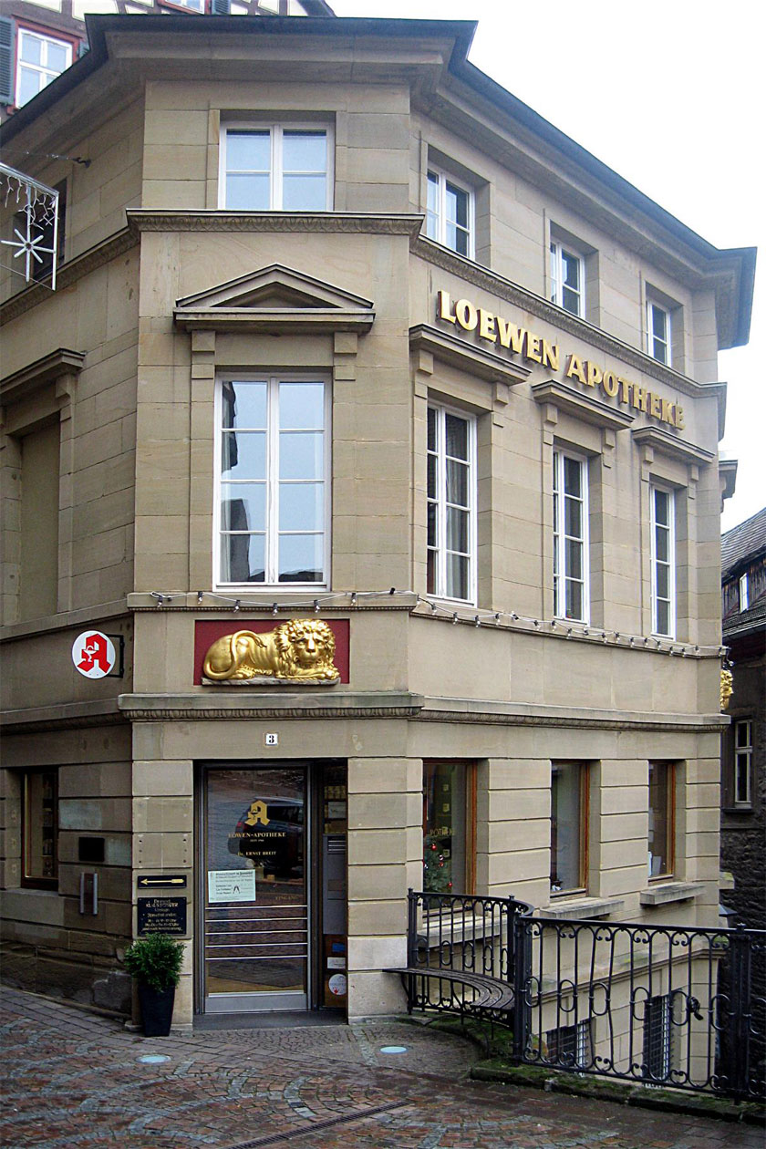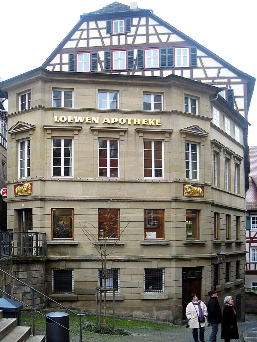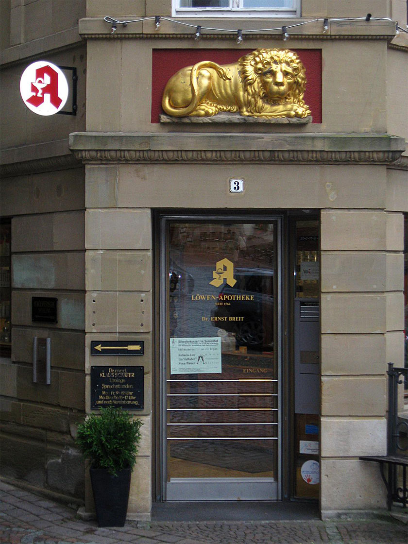 Die Löwen-Apotheke befindet sich in einem spätmitteralterlichen Gebäude direkt am Marktplatz. Reingeschaut habe ich nicht, aber auf der Homepage kann man auch ein Foto von der sehr schönen Materialkammer aus dem späten Barock anschauen, die wohl noch in Benutzung ist: http://www.apothekenloewen.de/html/unsere_apotheke.html