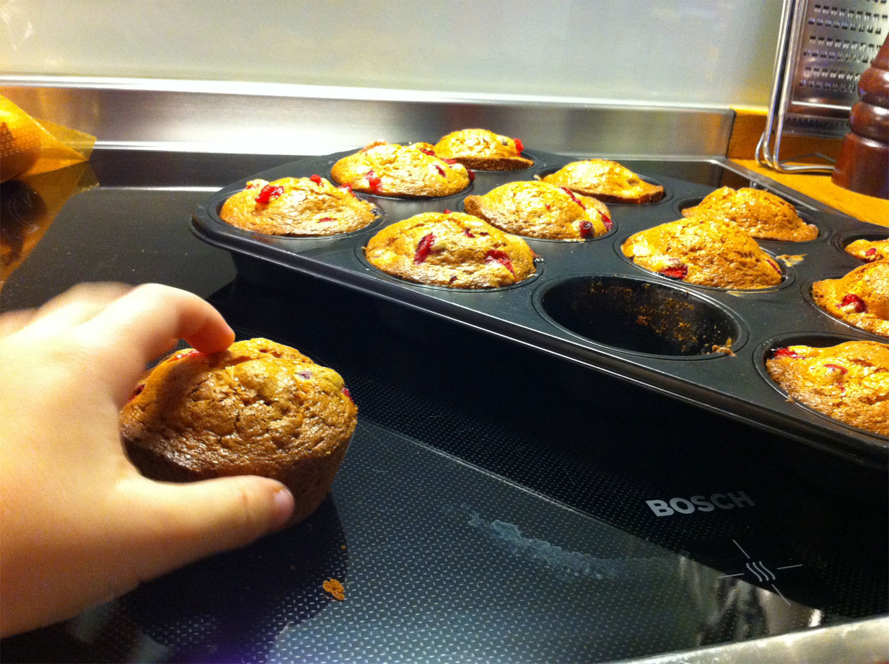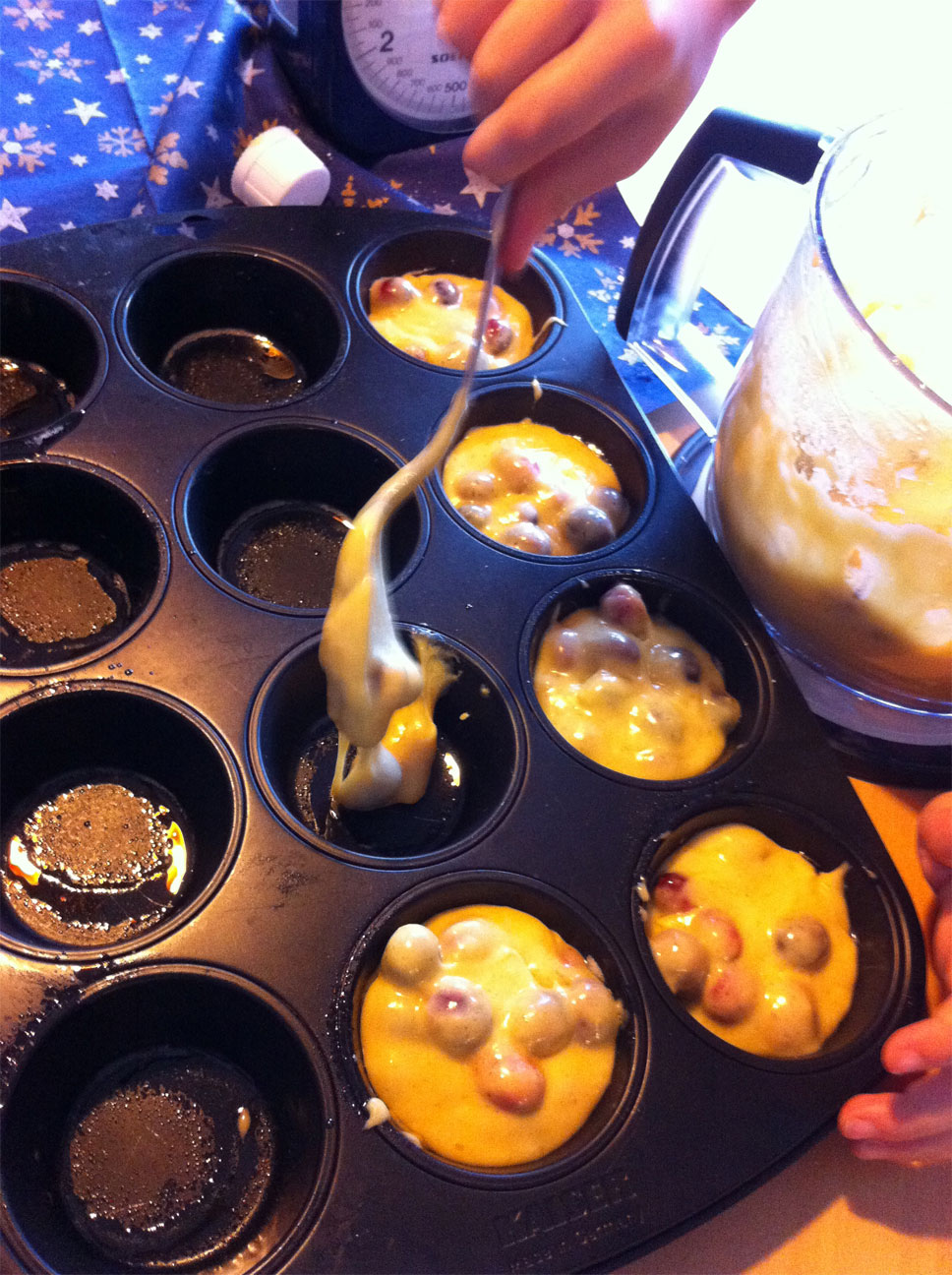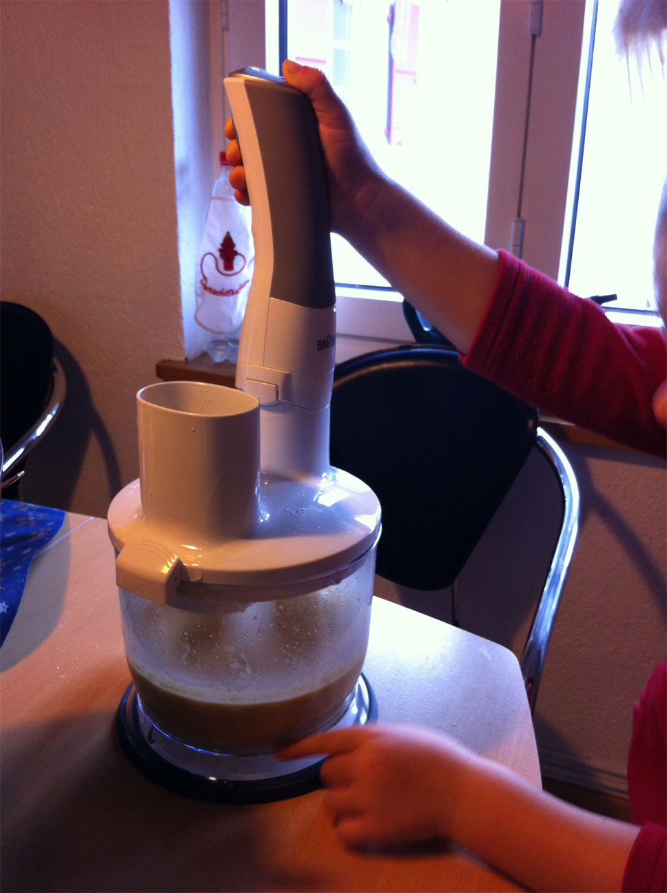 Dann wollte ich mich doch ans Zubehör wagen, speziell den Aufsatz mit dem man auch Teig mischen können soll – auch Pizzateig. Das wollte ich jetzt zwar nicht – dafür aber Muffinteig. Junior half mit – wie man sieht ist auch das Doppelknopf-drücken für einen 4 jährigen kein Problem.