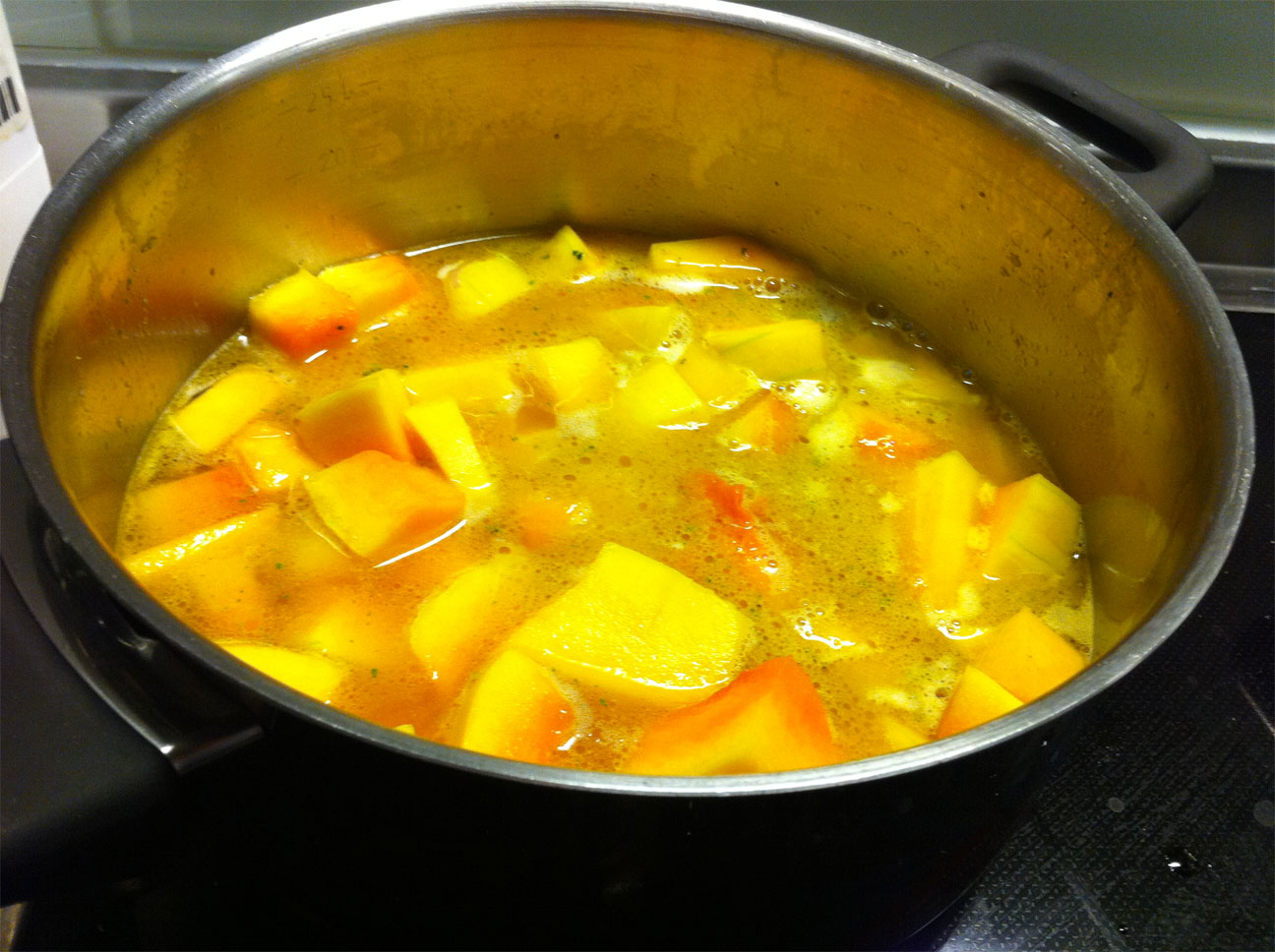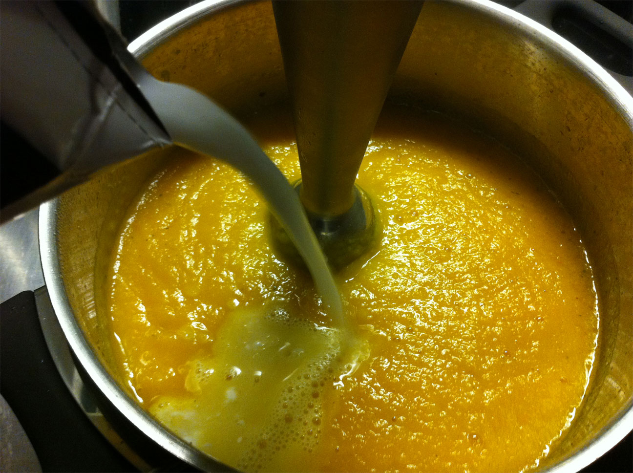 Der erste Test des Stabmixers war eine Kürbissuppe. Direkt im Topf pürieren ist hier kein Problem – der Mixkopf hat auf der Seite so „Wellen“ das spritzt auch fast nicht. Etwas gewöhnungsbedürftig fand ich die „2-Knopf-gleichzeitig-drück-Bedienung“ – man kann nur mixen, wenn man gleichzeitig mit dem Finger vorne und dem Daumen oben drückt. Ich denke mal, das ist eine gewisse Kindersicherung. Fazit jedenfalls: der Mixer püriert schnell und fein und lässt sich danach auch gut wieder waschen. Was will ich mehr? (Ach ja – und Junior schmeckt die Suppe)