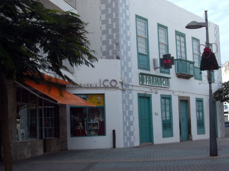 Ich wollte mich an den Apotheken auch einmal beteiligen. Ich war dieses Jahr nach Silvester wieder auf Lanzarote und habe dort am Rand der Fußgängerzone von Arrecife eine sehr landestypische und nicht touristisch gestylte Apotheke gefunden. Leider war sie nicht offen, da gerade Mittagspause war – so konnte ich auch nicht ins dunkle Innere fotografieren, das aber auch eher typisch mit Fliesen und Holz ausgestattet war. Der Eingang ist übrigens unter der Markise, nicht im Haupthaus :-)
