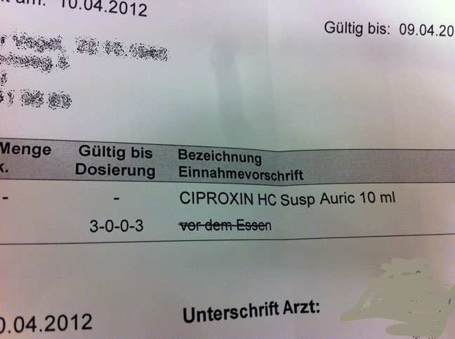 Für die medizinischen Laien: Es handelt sich um Antibiotika OHREN-Tropfen. Die nimmt man nicht ein, die gehören in die Ohren – und damit ist es absolut egal, ob das vor, mit oder nach dem Essen stattfindet.