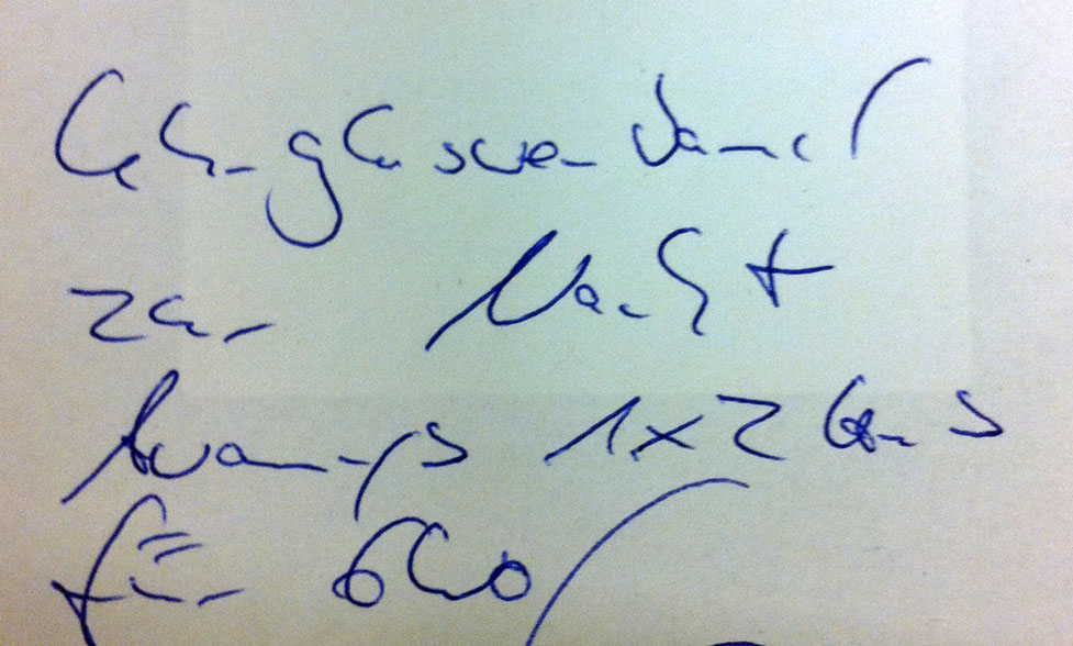 Aber einer von uns findet sich immer, der es lesen kann und wenn’s gar nicht mehr geht, wird der Chef gefragt. Wenn selbst der es nicht mehr lesen kann, tja dann ans Telefon. Wir sind heilfroh, dass die meisten Ärzte hier ihre Rezepte drucken, oder ihre Helferinnen schreiben lassen ^^