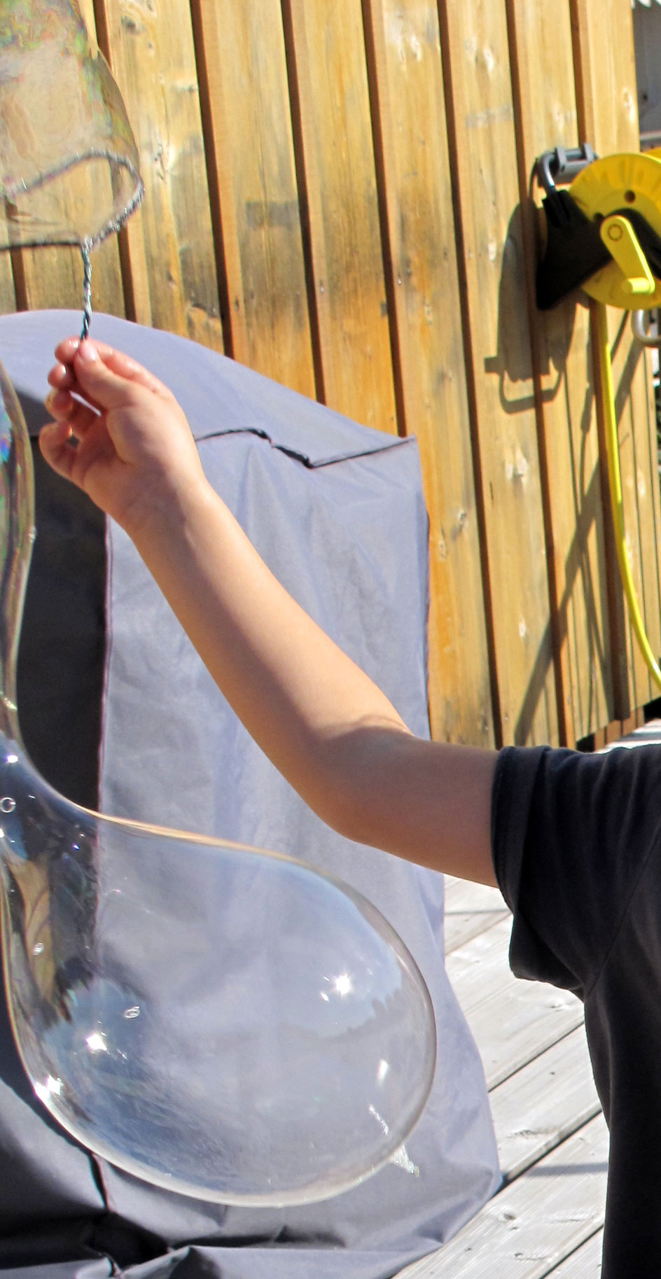 Ich liebe Seifenblasen fast so sehr wie Junior – und mit der Mischung halten sie auch super-lange. Wir haben auch noch eigene Seifenblasenringe gebastelt: aus Blumendraht und mit etwas Wolle umwickelt. Da man den Ring gross machen kann … gibt es auch Riesen-blasen: