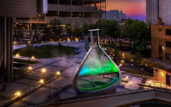 Im Stadtzentrum von Winnipeg (Kanada) steht diese Stahlskulptur – ein Erlenmeyerkolben, gleichzeitig voll und leer. Mit Wasservorhang unten und Wassernebel oben und das alles von Farben wechselnden LEDs beleuchtet bietet das ein ziemliches Schauspiel.