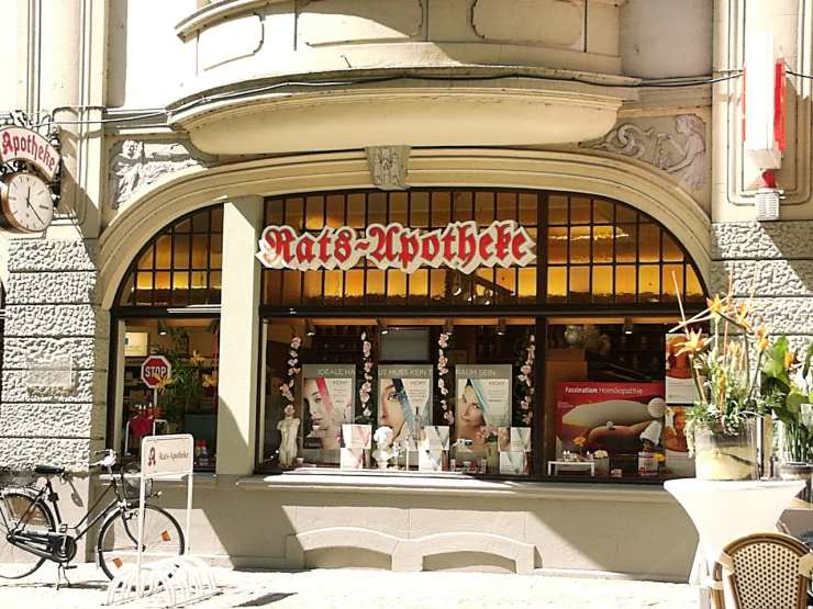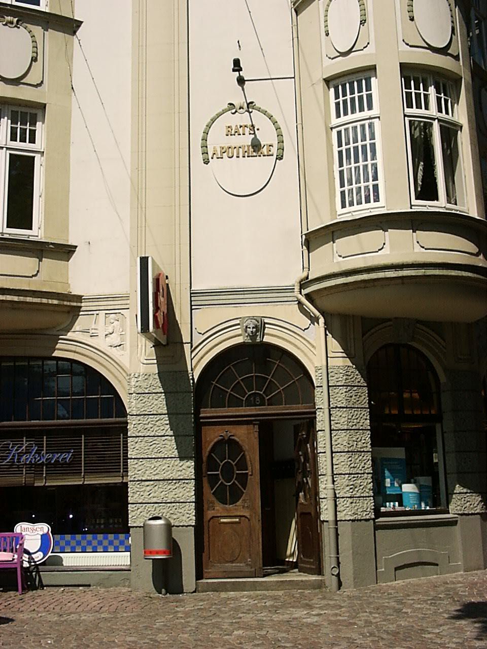 Dabei ist mir diese hier in Oldenburg (Niedersachsen) ins Auge gesprungen. Besonders interessant fand ich dabei die Allegorien(?) mit Apothekermotiven an der neobarocken Fassade. Laut einem Hinweisschild wurde die Apotheke 1907 erbaut.