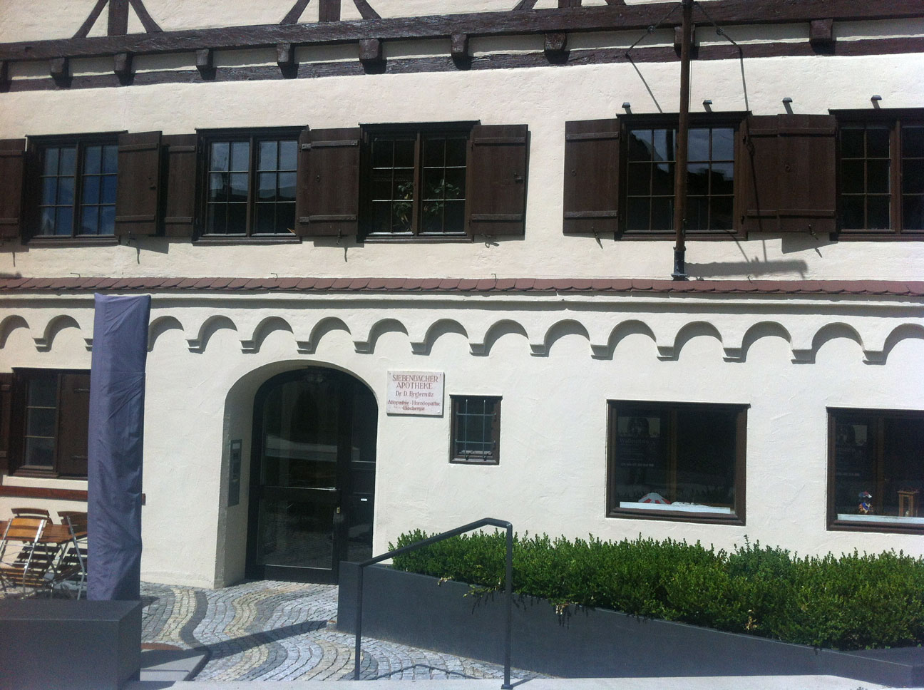 als ich vor kurzem in Memmingen (Deutschland, Bayern) war, kam ich an diesem schönen alten Haus vorbei. Das sogenannte „Siebendächerhaus“ ist eins der 7 Wahrzeichen der Stadt, wie man einer Tafel an der Seite entnehmen kann (https://de.wikipedia.org/wiki/Siebend%C3%A4cherhaus) Die eigentliche Apotheke ist auf der gegenüberliegenden Straßenseite in einem nicht besonders spektakulären Haus (Foto 1). Das Siebendächerhaus beherbergt aber scheinbar noch weitere Räume des Apothekers (Tafel Foto2).