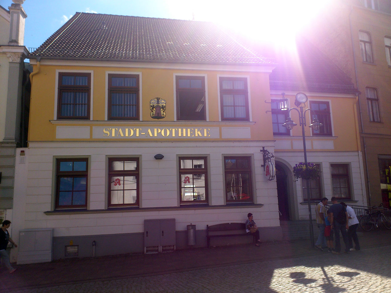 Diese hübsche, leider am Sonntag geschlossene Apotheke stammt aus Wolgast in Mecklenburg-Vorpommern, die sozusagen das Eingangstor nach Usedom darstellt. Leider konnte ich die Sonne nicht dazu bewegen, sich schnell zur Seite zu begeben, daher leider etwas Gegenlicht (und mein Handy hat auch (noch) keine Gegenlichtblende…)
