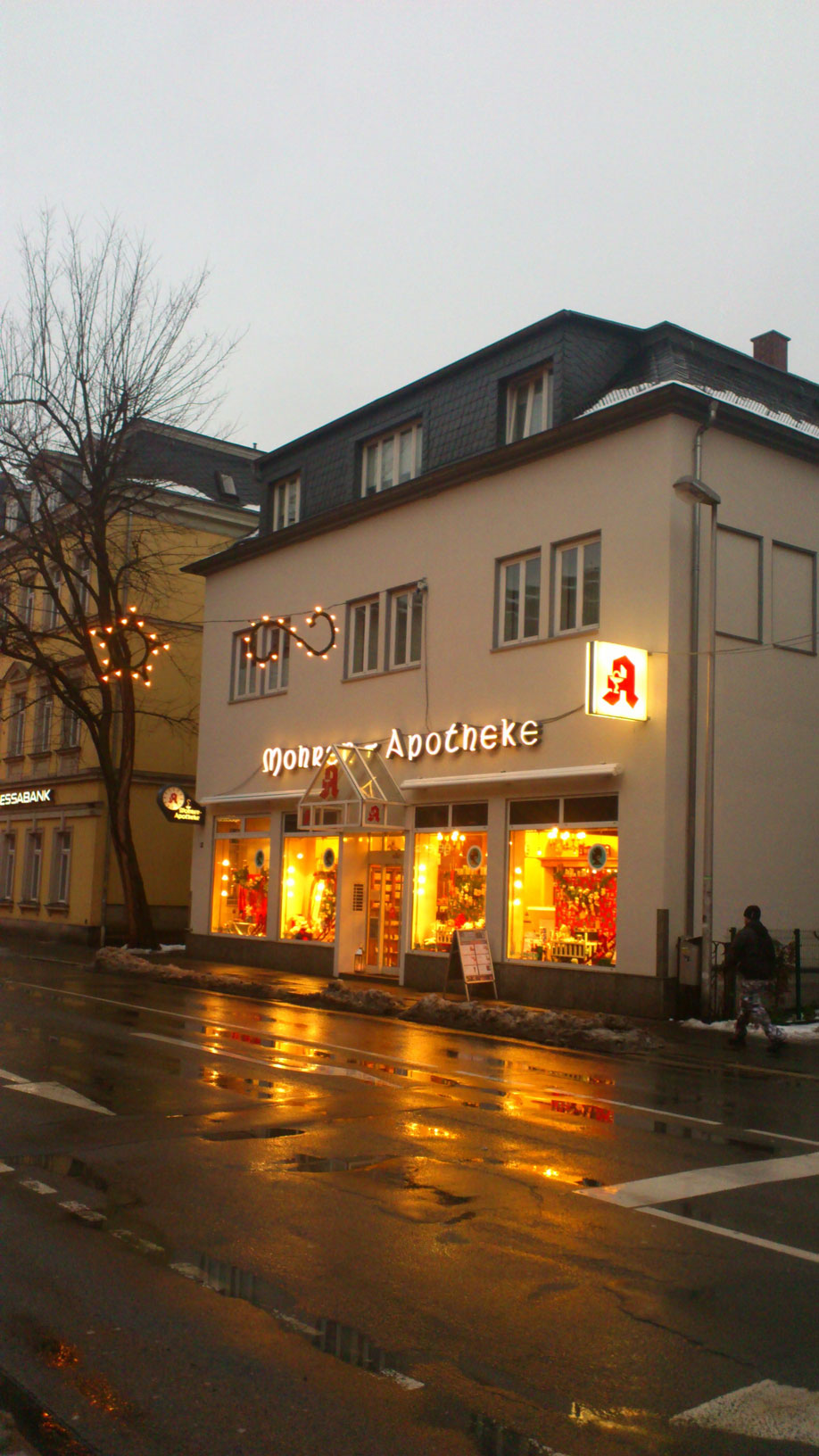 Die zweite Apotheke befindet sich gegenüber dem Bahnhof und hatte schon geschlossen. Bei ihr fand ich eher das Gebäude sehr hübsch, innen ist sie sehr modern und funktionell.