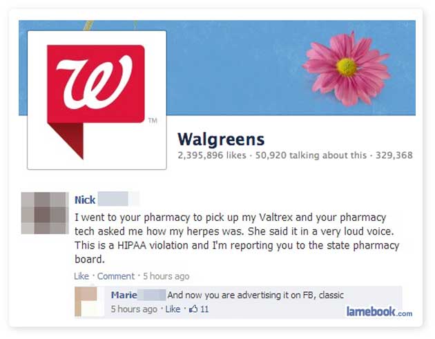 Nick: „Ich bin in Eure Apotheke gegangen um mein Valtrex abzuholen und eure Pharmaassistentin hat mich gefragt, wie es meinem Herpes geht. Sie hat das in einer sehr lauten Stimme gesagt. Das ist eine HIPAA Verletzung und ich werde Euch an die staatliche Apotheken-Kontrollstelle melden.“