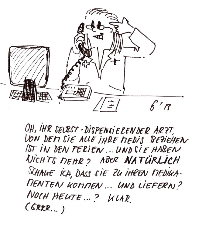 Oh, Ihr selbstdispensierender Arzt, von dem Sie alle ihre Medis beziehen ist in den Ferien … und sie haben nichts mehr? Aber natürlich schaue ich, dass Sie zu ihren Medikamenten kommen … und liefern? …Noch heute? … klar. (Grrrr!)