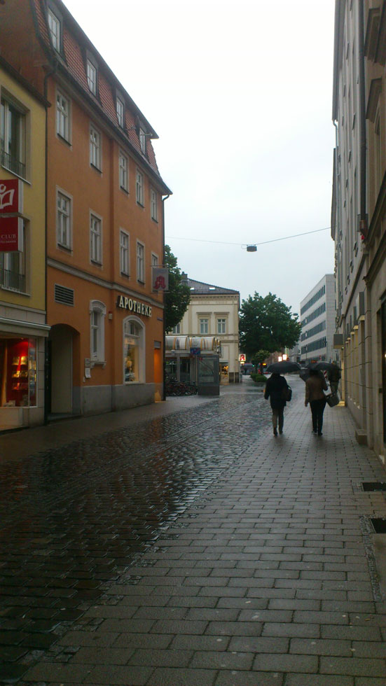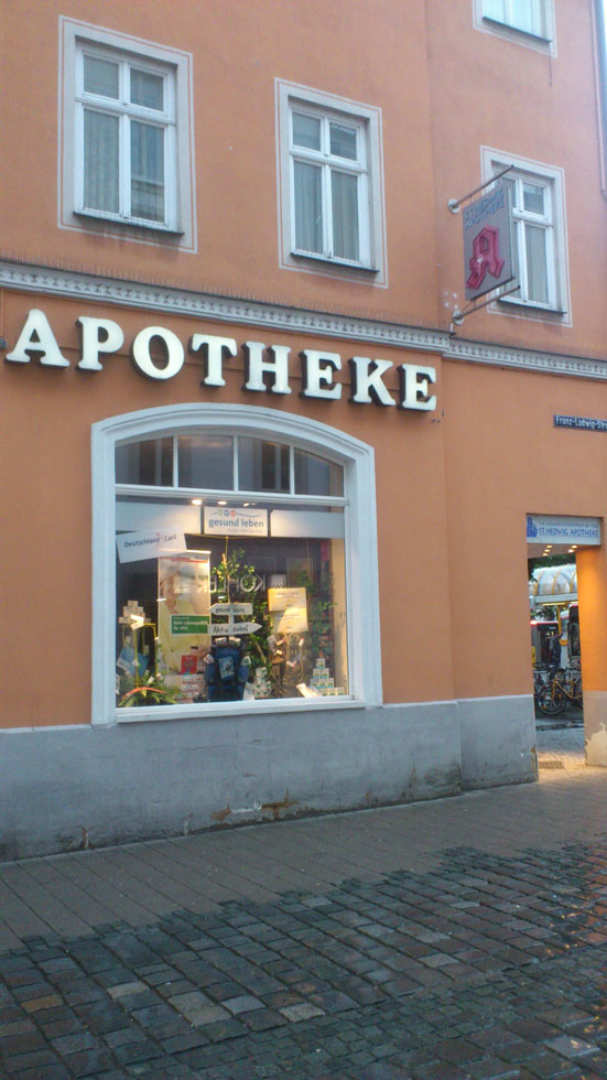 Die Bilder im Regen stammen aus Bamberg. Dort finden sich in der Nähe des ZOB gleich 3 Apotheken hintereinander. Die beiden ersten habe ich fotografiert – zur Dritten (deren Schilder sind die überbelichteten Punkte oberhalb der Regenschirme) bin ich wegen des netten Wetters nicht mehr gelaufen – aber das ist auch eine hypermoderne, großzügig ausgestattete (dafür aber auch austauschbare) Apotheke.