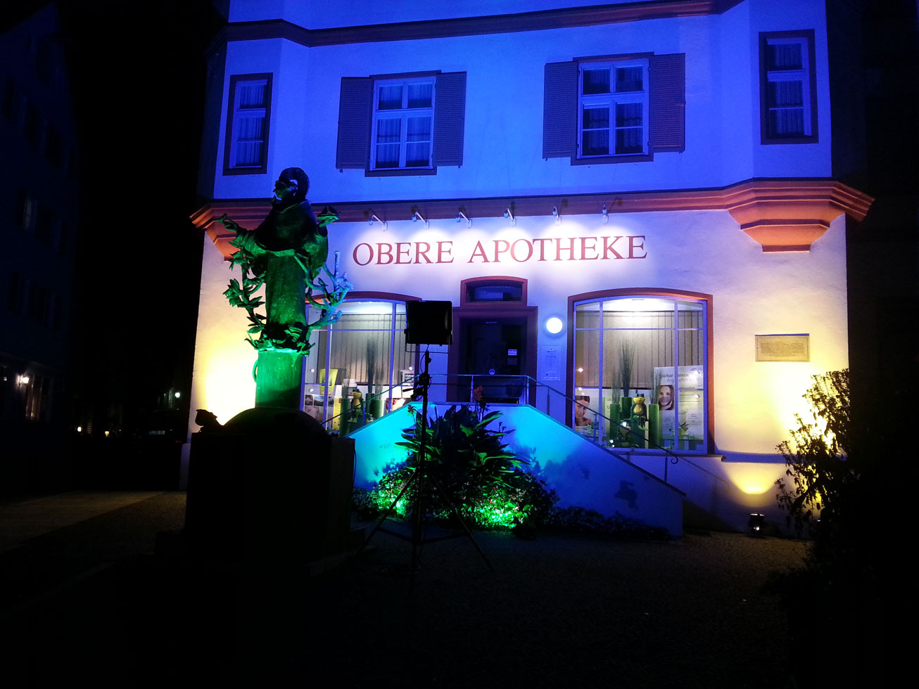 Kürzlich lief ich nachts in Dillingen an der Donau an einer – im Rahmen einer Festlichkeit – toll beleuchteten Apotheke vorbei. Die sah in der Dunkelheit wirklich schön aus, so dass die ich doch glatt mal für deine ‚Apotheken aus aller Welt‘-Aktion geknipst habe.