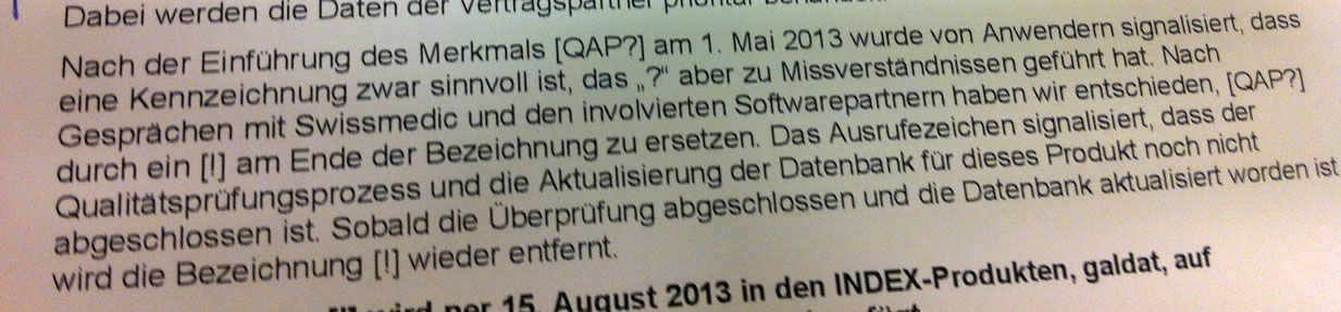 Das sah man dann auch sehr rasch daran, wie sich im Apothekenprogramm die Medikamente mit dem Nachsatz (qap?) = quality approved? vermehrten. Das war die Kennzeichnung, die an die Medikamente der Firmen gehängt hat, wo in der Fachinformation eine Änderung stattgefunden hat, welche noch nicht ins Computersystem übertragen werden konnte.