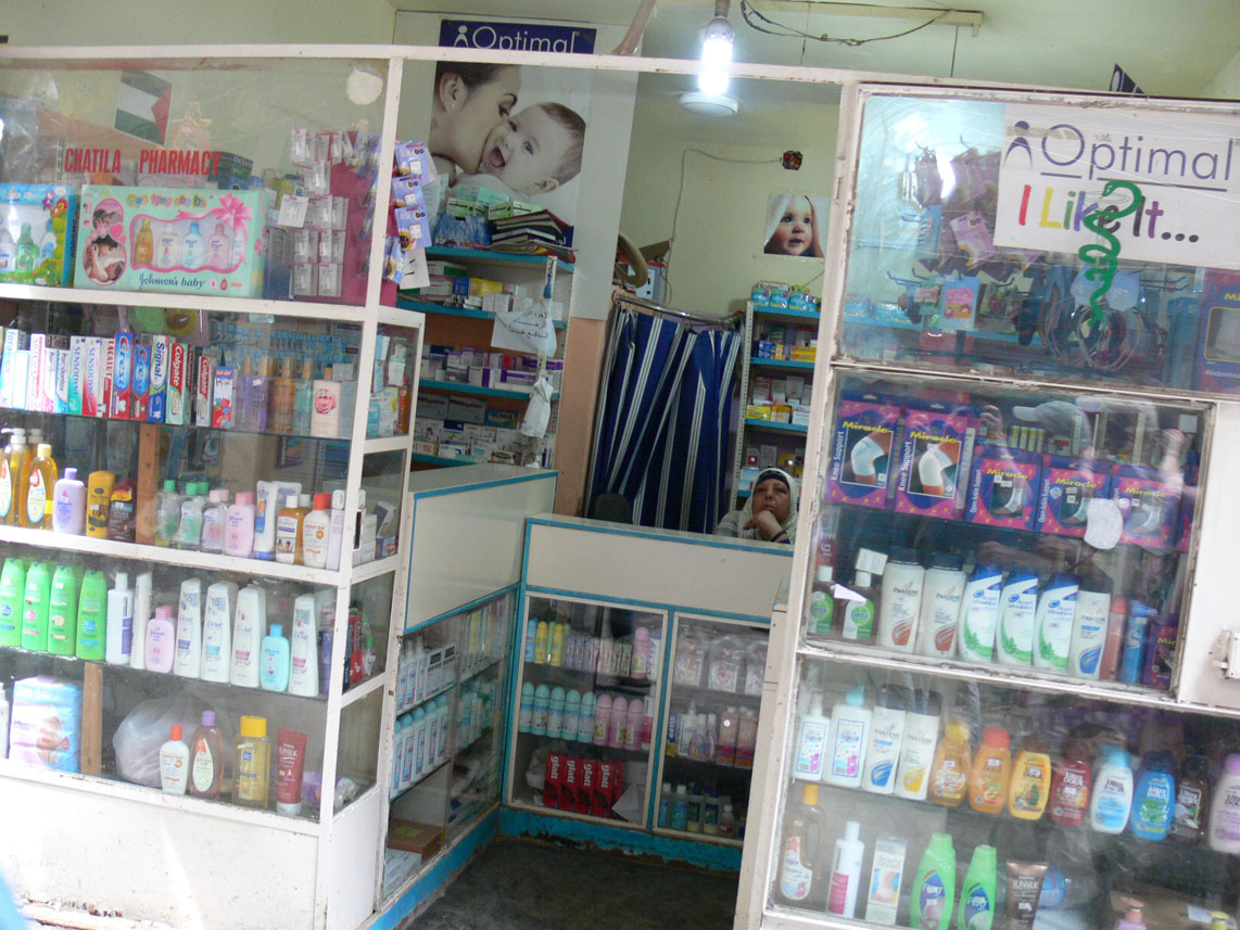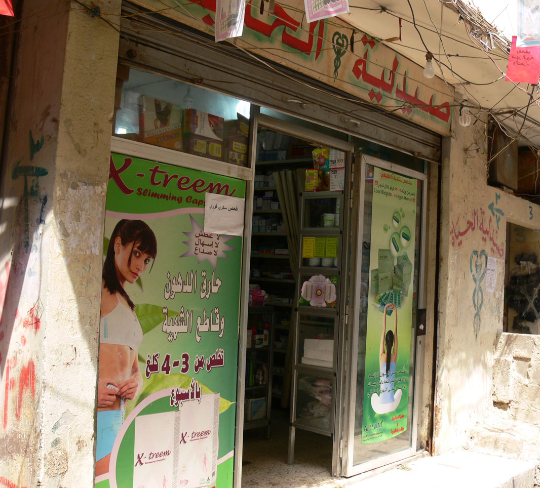 Ich habe noch Bilder von einer Reise in den Libanon (2011). Die Apotheke liegt in dem palästinensischen Flüchtlingslager Chatila in Beirut. Das Flüchtlingslager ist offiziell exterritoriales Gebiet, also die libanesische Polizei und das Militär haben dort nichts zu sagen. Mittlerweile hat sich die Lage dort wohl noch deutlich verschärft im Vergleich zu meinem Besuch 2011, da auch sehr viele Palästinenser aus Syrien fliehen mussten.