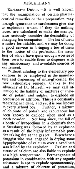 Ohne weiter einzugehen auf die elementaren Vorsichtsmassnahmen, die in der Herstellung und Umgang mit Nitro-Glycerin zu tun haben – dem nun, dank Dr. Murrell beliebten Heilmittel – möchten wir aufmerksam machen auf die Gefährlichkeit von Mischungen von Kaliumchlorat und Schwefel das auf Erschütterung und Reibung Explodiert. Dies ist ein konstant wiederauftretender Unfall und doch etwas, das jeder Schuljunge kennen sollte.