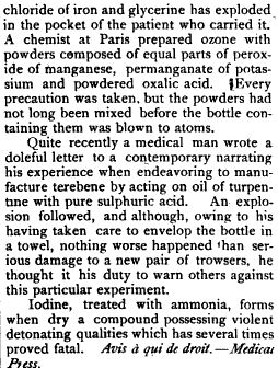 Ein Apotheker in Paris hat Ozon präpariert zusammen mit Pulver bestehend aus gleichen Teilen Manganperoxid und pulverisierter Oxalsäure. Jede Vorsichtsmassnahme wurde gemacht, aber die Pulver waren noch nicht lange gemischt, da hat es die Flasche, die sie enthielt in ihre Atome zerblasen.