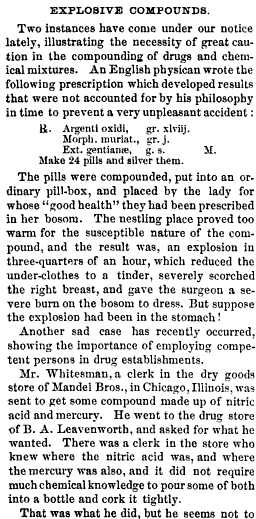 Die Pillen wurden gemischt, hergestellt und in eine normale Pillendose übergegeben und die Lady für dessen „gute Gesundheit“ sie verschrieben wurden hat sie an ihrem Busen getragen. Der Lagerort erwies sich als zu warm für die anfällige Natur der Mischung und das Resultat war eine Explosion nach einer dreiviertelstunde, die ihre Unterwäsche in Asche verwandelte, die rechte Brust stark verbrannte und dem Chirurgen zusätzlich noch eine Brandwunde am Bauch zum Verbinden gab. Aber stellen Sie sich vor, die Explosion hätte sich im Bauch zugetragen!