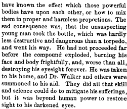 Das war was er tat, aber er scheint nicht gewusst zu haben, was für einen Effekt diese beiden starken Mittel aufeinander haben oder wie man sie in anständigen und harmlosen Proportionen mischt. Die traurige Konsequenz war, dass der nichts ahnende junge Mann die Flasche nahm – die kaum weniger zerstörerisch und gefährlich ist als ein Torpedo –und seines Weges ging. Er kam nicht weit, bevor die Mischung explodiert ist, dabei sein Gesicht und seinen Körper schrecklich verbrannt hat und, am schlimmsten von allem, sein Augenlicht für immer genommen hat. Er wurde zu sich nach Hause gebracht und Dr. Walker und andere wurden zu seiner Hilfe gerufen. Sie haben alles gemacht, was Kunst und Wissenschaft konnte um sein Leiden zu mildern, aber es war jenseits der Macht der Menschen seinen verdunkelten Augen wieder Licht zu geben.