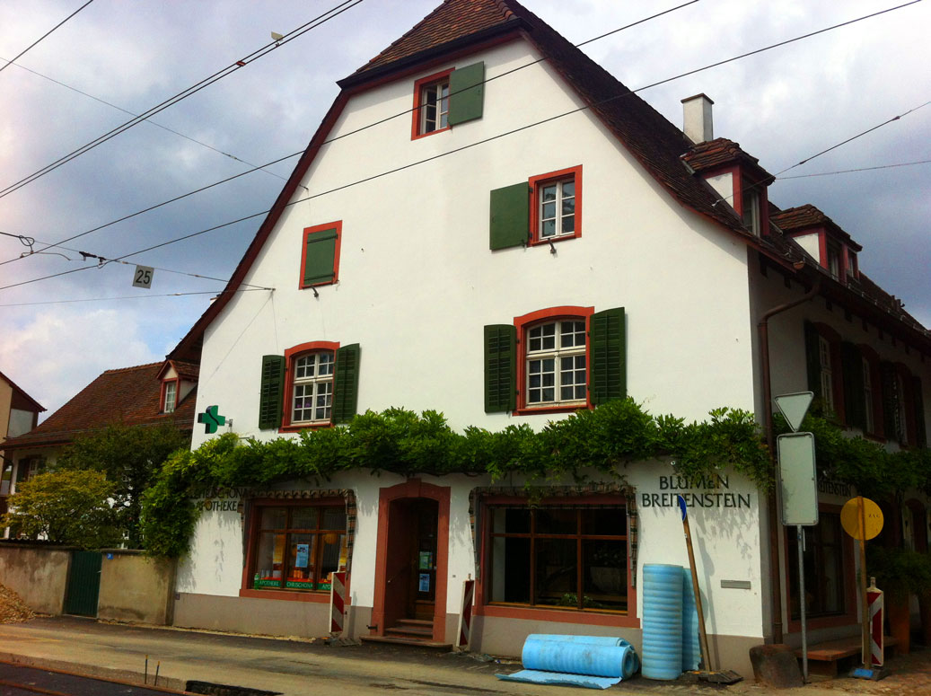 Das Bild ist schon etwas älter – in Riehen wurde da ziemlich etwas an der Strasse gebaut. Das war sicher nicht toll für diese kleine Apotheke praktisch mitten in der Baustelle. Im selben Haus rechts das Blumengeschäft, links die Apotheke: