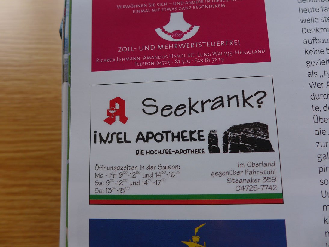 von meinem sturmbedingt leider nur sehr kurzem Aufenthalt auf Helgoland hier drei Fotos von der Inselapotheke. Das letzte Bild ist passenderweise die Werbung in der Infobroschüre des Halunderjets.