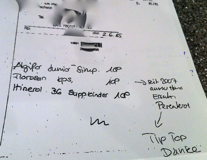 (P.S. hinter dem Perenterol war noch ein Fragezeichen – das wurde bei der Rückantwort abgeschnitten, wie der Rest vom „ausser Handel“)