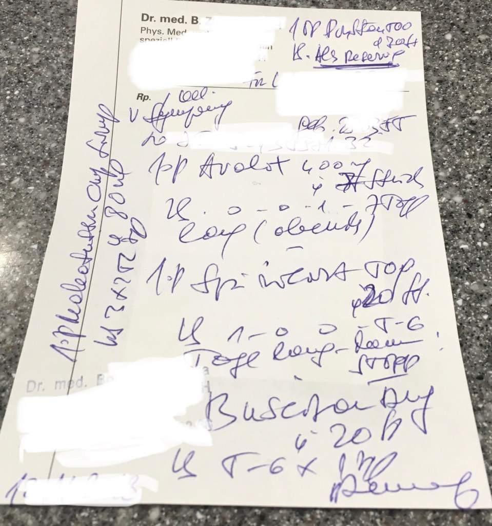 Wer weiss? Vielleicht haben sich die Ärzte hier gedacht: „Wenn ich das so unleserlich wie möglich aufschreibe, dann sieht man auch nicht, wenn etwas falsch geschrieben ist?“ … Oder sie schreiben einfach immer so mies. Bisserl ungeschickt, wenn wir in der Apotheke dann rätseln müssen, was es denn sein darf.