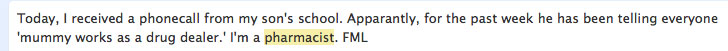 Today, I received a phonecall from my son’s school. Apparently, for the past week he has been telling everyone ‚mummy works as a drug dealer.‘ I am a pharmacist. FML