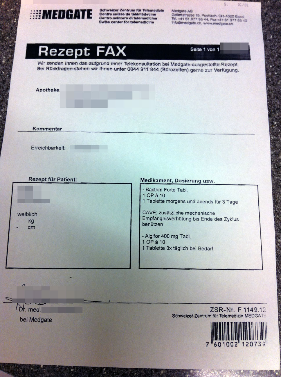 Eine andere einfache Variante an ein Rezept zu kommen ist bei uns die Tele-Medizin. Der Arzt wird via Telefon konsultiert – er kann gezielter auf den Patienten eingehen. Das Rezept wird dann in eine Apotheke der Wahl gefaxt. Schön auch: der Arzt ist für Nachfragen erreichbar.