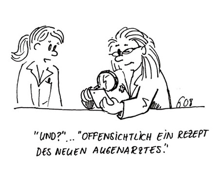 Drogistin: „Leider haben wir nur Lesebrillen mit der gleichen Korrektur in beiden Gläsern, für das, was sie wollen, müssen sie zum Optiker.“