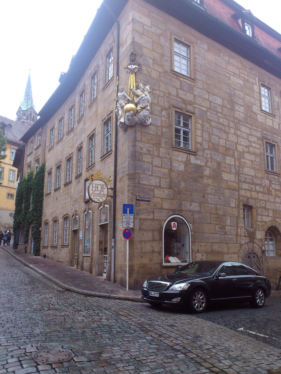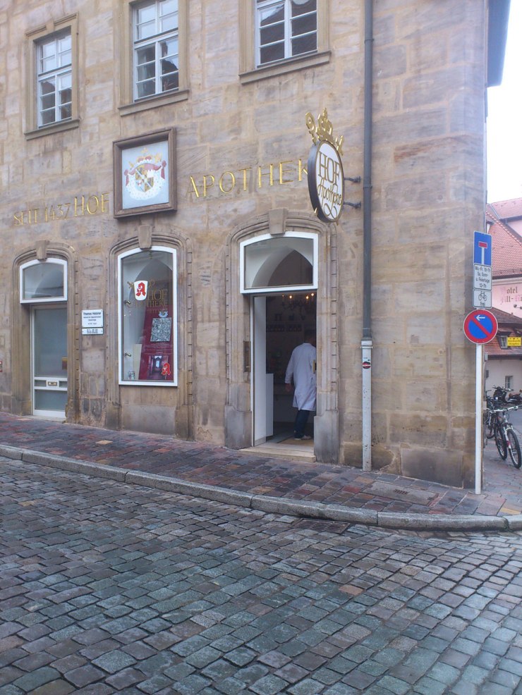 Die Bilder im Regen stammen aus Bamberg. Dort finden sich in der Nähe des ZOB gleich 3 Apotheken hintereinander. Die beiden ersten habe ich fotografiert – zur Dritten (deren Schilder sind die überbelichteten Punkte oberhalb der Regenschirme) bin ich wegen des netten Wetters nicht mehr gelaufen – aber das ist auch eine hypermoderne, großzügig ausgestattete (dafür aber auch austauschbare) Apotheke.