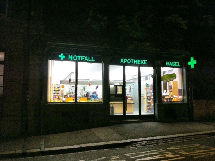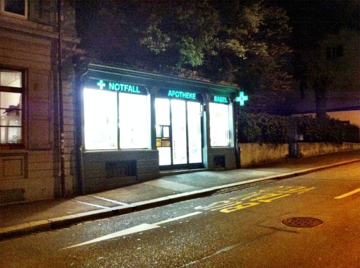Das ist die Notfall Apotheke in Basel, gegenüber vom Kantonsspital. Sie ist eine etwas speziellere Apotheke, da sie dann offen hat, wenn andere Apotheken geschlossen sind. Darum auch die Nachtaufnahme: da ist sie nämlich offen. Entschuldige die schlechte Bildqualität – Nachtaufnahmen mit dem iPhone werden nicht gerade berauschend.